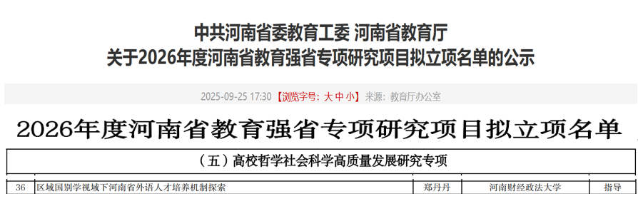 9月25日,中共河南省委教育工委、河南省教育厅对《2026年度河南省教育强省专项研究项目拟立项名单》进行公示,外语学院教师郑丹丹申报的《区域国别学视域下河南省外语人才培养机制探索》成功入选,充分彰显了我院主动对接国家战略和区域发展需求,在区域国别学研究领域的新突破和新成效。